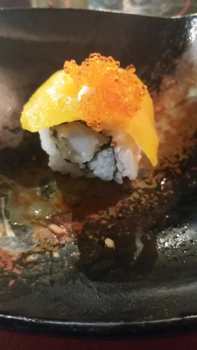 芒果炸蝦卷, 有幾種口感, 芒果香軟清甜, 壽司飯,加上內裏炸蝦,不同層次,但味道配合,正。