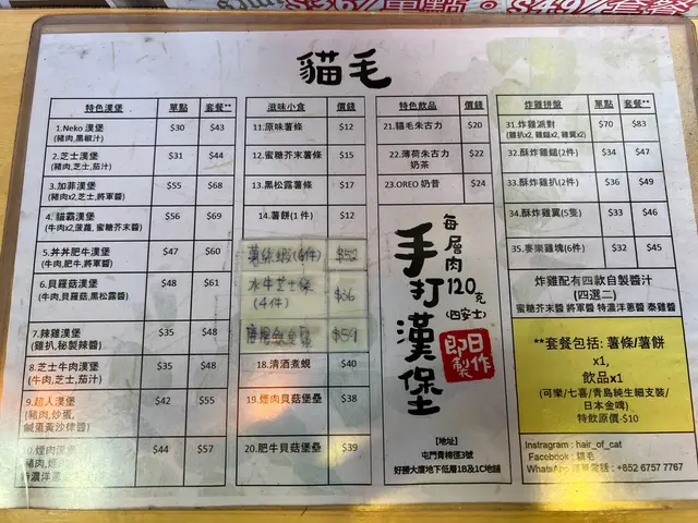 呢間喺紅橋新開左一排嘅漢堡店,以貓為主題,除左店名叫貓毛,門口都放咗個mon播住貓嘅有趣短片。