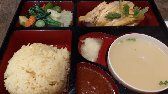 我點了「泰式海南雞飯」,油飯乾爽,可以再入味D。雞肉嫩滑,份量很多,配合薑蓉和泰式辣醬,十分醒胃,我覺得泰式辣醬是整個餐的靈魂。蒜蓉炒菜很入味,令這個餐不只有肉類,還有蔬菜,營養比較均衡。湯很香胡椒味,正!