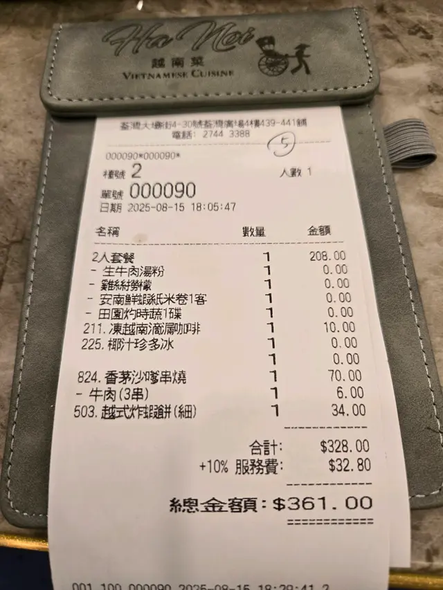 抵食荃灣廣場越南菜 Alison 1937Level 42025-08-15232 views Follow 今晚我同女友去左荃灣廣場一間名叫 Hà Nội 的越南菜餐廳食晚飯。餐廳環境好舒服,裝潢散發著濃濃的越南風情。我地叫咗二人套餐。首先上來嘅係生牛肉湯粉,湯底香濃,牛肉新鮮,配上香草和檸檬,真係一流!跟住係雞絲撈檬,涼爽可口,正好配合天氣熱嘅晚上。田園灼時菜色澤鮮艷,脆口又健康,當然少不了安南鮮蝦紫米卷,包住鮮蝦和新鮮蔬菜,口感一流。甜品方面,我哋叫咗椰汁珍多冰,椰香四溢,清涼解渴。再來杯凍越南滴漏咖啡,濃郁香滑,真係唔可以錯過。最後,仲加咗香茅沙嗲牛肉串燒同越式炸蝦餅,串燒味道濃厚,炸蝦餅外脆內嫩。今晚的晚餐真係令我大滿足,食得好開心!The above review is the personal opinion of a user which does not represent OpenRice's point of view.LikeShare抵食荃灣廣場越南菜 Ha Noi 越南菜 https://s.openrice.com/QrKT01lTT00Report Post Ratings4Taste4Decor4Service4Hygiene4ValueDining MethodDine In
