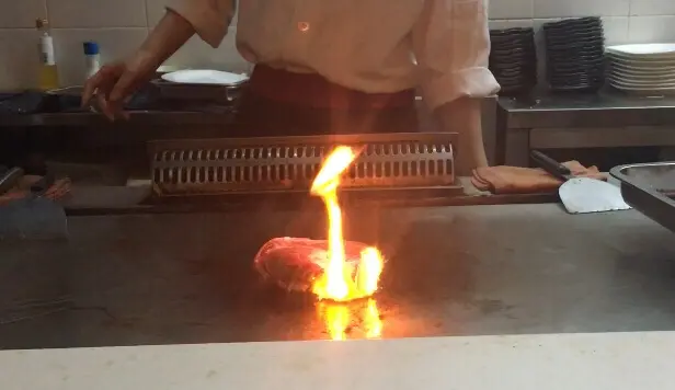開始煎啦,廚師落左少少酒,牛扒快速被燒起了,有得食又有得睇😆