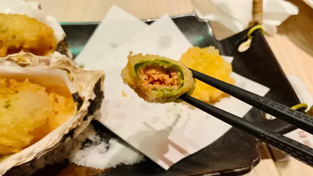 🍤牡蠣野菜天婦羅同樣非常有心思,食材亦好創新!除了2個大大嘅日本蠔肥美新鮮外,還有鮮粟米、尖椒天婦羅都好特別!鮮粟米🌽天婦羅粒粒外層脆香入面juicy,而尖椒內竟然食到明太子,真係好有驚喜 😋可以話係脆香不油膩之餘,增添多份口感。