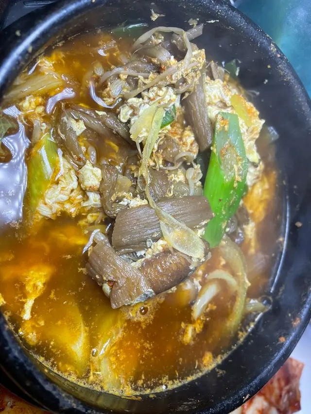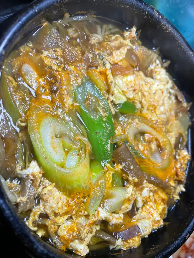 是這頓餐點的開場佳作。湯裡有豐富的食材,像牛肉、大蔥、蕨菜和豆芽,搭配微辣的湯底,整體味道層次分明。湯汁因加入韓式辣椒粉而呈鮮紅色,看上去就令人垂涎欲滴。牛肉的精華完全融入湯汁,讓整道菜更醇香濃郁。細細品嚐之下,那股溫暖微辣的感覺彷彿瞬間喚醒了味蕾,實在是令人回味無窮!
