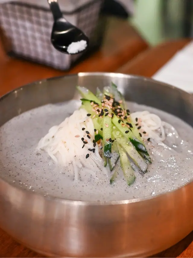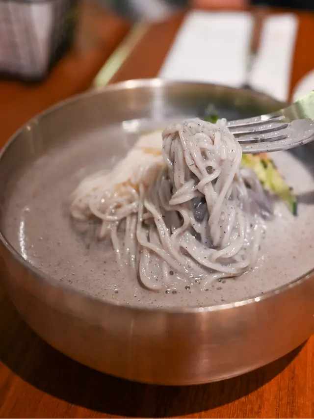 配搭濃稠順滑的黑芝麻豆漿,冷麵更香更滑,可自己加糖/鹽調味,是一道很創新的料理!