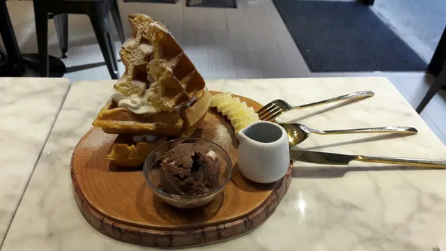 再過多10分鐘左右,迷李香蕉窩夫都送上來,哇,又不是迷李版,正,窩夫外面幾脆口,仲配埋Dreyers石板街雪糕,超正