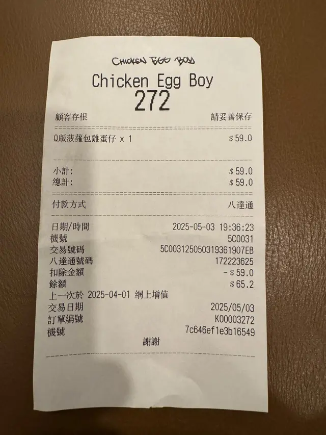 排隊30分鐘嘅雞蛋仔?究竟值唔值得呢? MoniqueheungLevel 32025-05-0938 views Follow 丫女近排表現乖 所以就獎勵佢 過黎食近期社交平台爆紅嘅Q版菠蘿包雞蛋仔 山長水遠去到 我緊係叫一底菠蘿包雞蛋仔+一底Hershey‘s朱古力雞蛋仔 我都未影完相打卡 佢已經急不及待放入口係咁食😆 菠蘿包雞蛋仔真係好可愛,表面脆卜卜內裡軟綿綿而Hershey‘s雞蛋仔入口就感受到香濃朱古力味 值唔值得? 見佢舉高大拇指就知道值得啦。 一路睇住佢嘅開放式廚房整 每一步都睇住特別安心 重要滿足埋視覺享受 小朋友一路睇住仲話想自己整😆 我都將個製作過程影咗幾張相俾大家一齊睇 你哋睇吓佢食得幾開心 食完第二日已經話要再去 😆 講句題外話 上網睇到佢係慈善基金運作 所有盈餘會作為慈善用途 又好味,又可以做善事 你哋又覺得值唔值得呢?The above review is the personal opinion of a user which does not represent OpenRice's point of view.1Share排隊30分鐘嘅雞蛋仔?究竟值唔值得呢? CHICKEN EGG BOY https://s.openrice.com/QrKT0NmvS00Report Post Ratings5Taste5Decor5Service5Hygiene4ValueDate of Visit2025-05-03Dining MethodDine InType of MealDinner