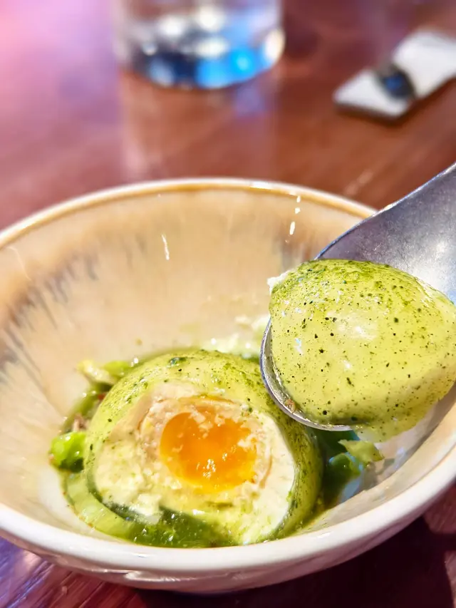 一道模仿蛋的創意料理。"蛋黃"是以醬油醃製的糖心鵪鶉蛋,"蛋白"是注入雞肉風味的Cream Mousse,"蛋膜"則是菠菜Glaze。