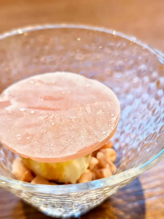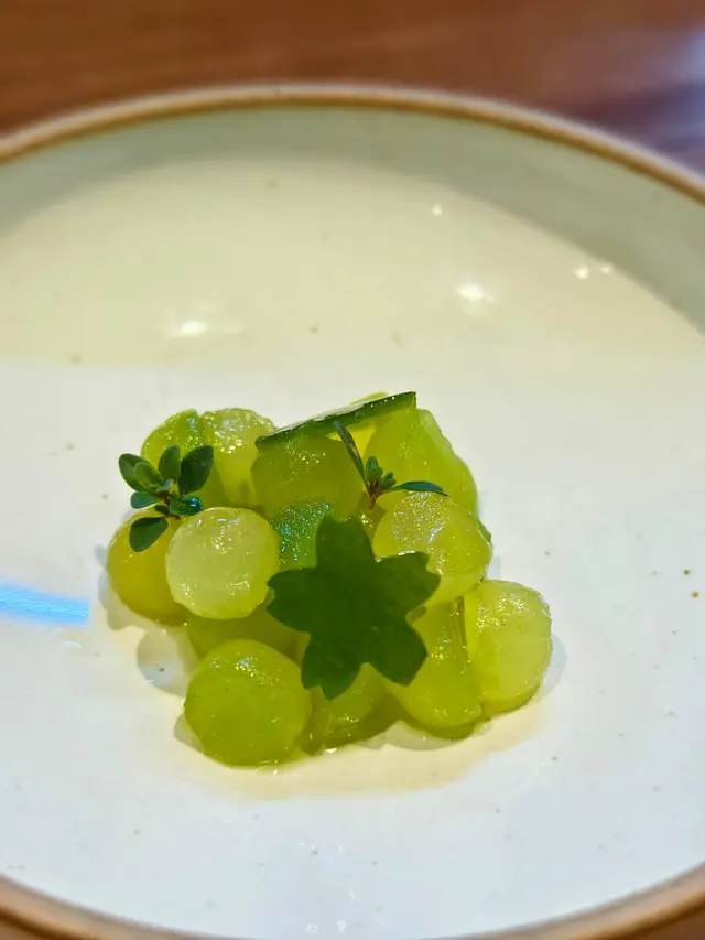 > 哇,沒有想過這一餐差不多去到尾聲,還有驚喜。抽真空壓縮抹茶逼入青瓜內,食的時間有青瓜的爽脆,但同時有抹茶的茶香獨有草本氣息。配上甜美哈密瓜清湯,真係好有一種好refreshing 的感覺。