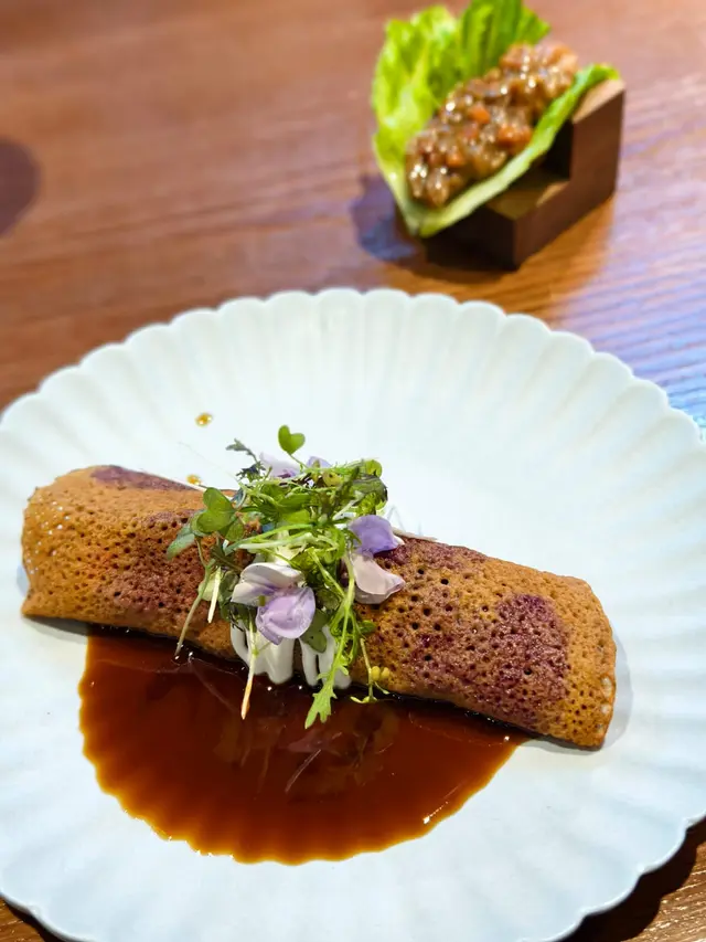 採用自製混合種子黑麥麵包、柚子醬凍、北海道海膽包裹在新鮮烘脆紫菜中,刷上自家醬油,並以青檸皮作為結尾。