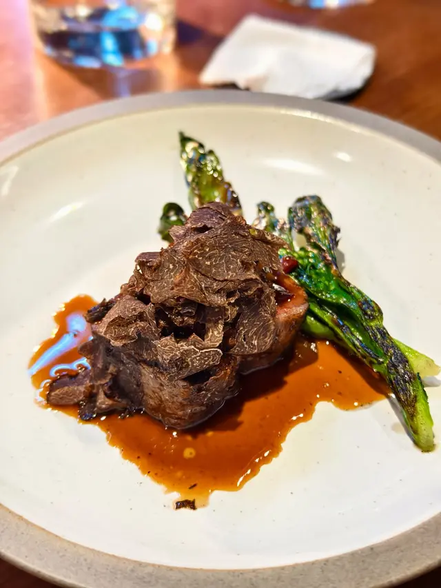 A3和牛,搭配炭燒本地『菜之花』,醬汁由臘腸和醃製蠔菇皇製成,上面撒有新鮮刨的松露。