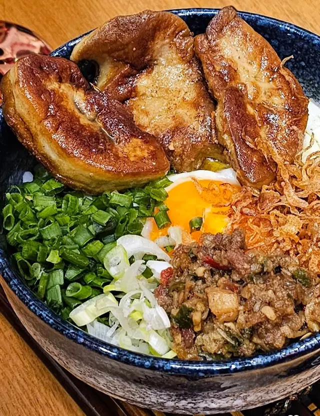 旁邊還有自家鮮炸的蒜片,肉碎和大陽蛋,加一些秘製XO醬,火辣甘香又惹味,味道層次層層遞進,真係食到唔停口,不過食完真係要跑多幾圈減番吓😅