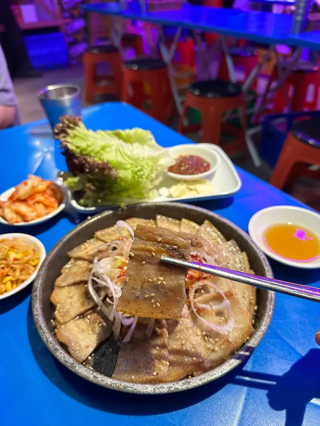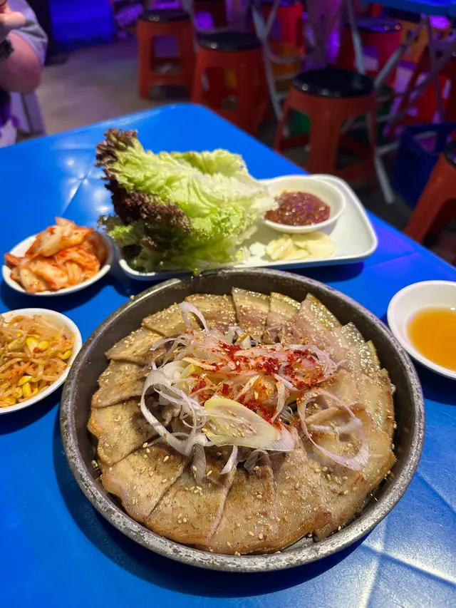 五花肉仲配上生菜,蒜片,豆瓣醬,洋蔥絲,加埋一齊食,可以減輕五花肉嘅油膩感,別有一番滋味