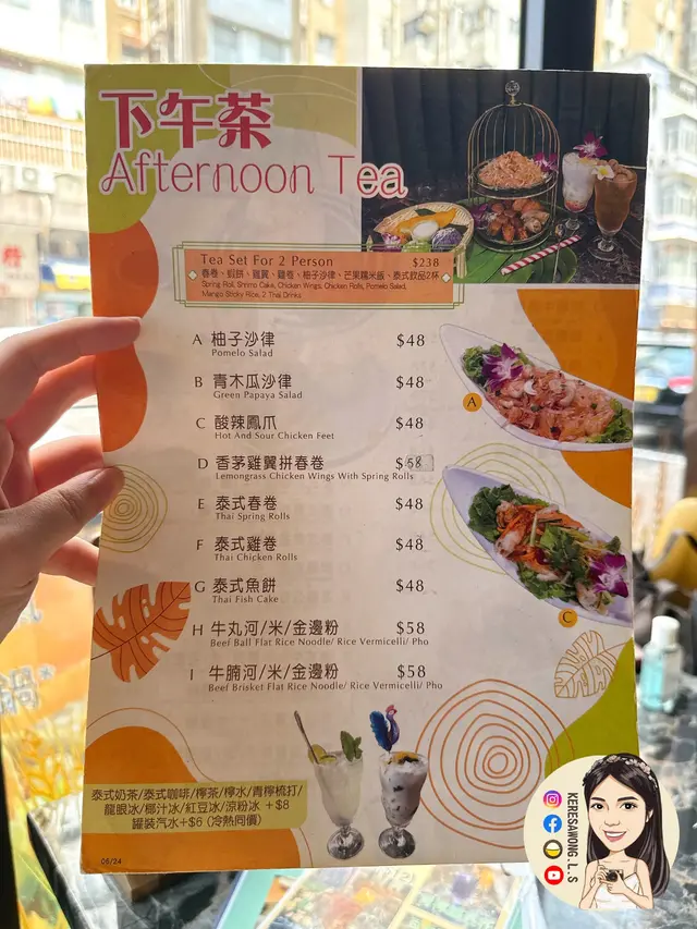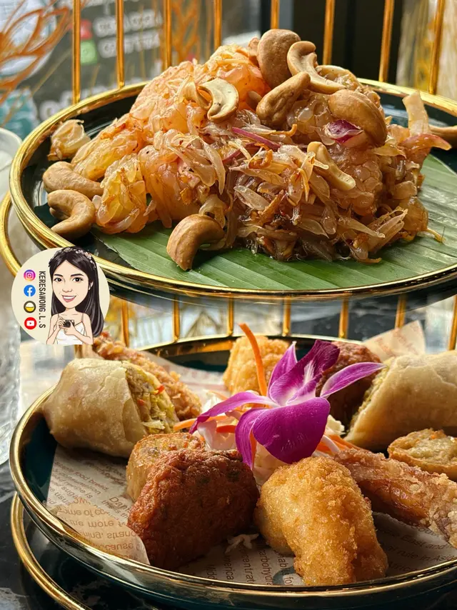 集泰式人氣小食嘅層架下午茶, 上層有柚子沙律, 下層有春卷、蝦餅、雞翼、雞卷, 每款炸物脆而不油, 另配有芒果糯米飯同埋自選泰式飲品兩杯。