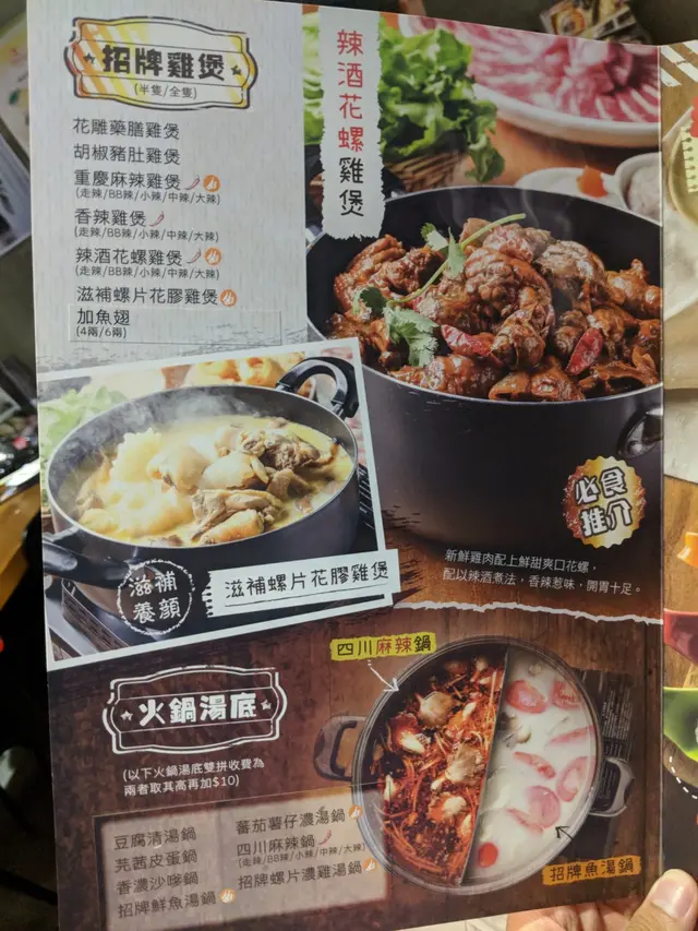 火鍋店嘅鍋底有唔同款式嘅雞煲,有重慶雞煲鑒胡椒雞煲等等,而最好就係可以揀唔辣。不過食雞煲就梗係要食辣㗎啦。