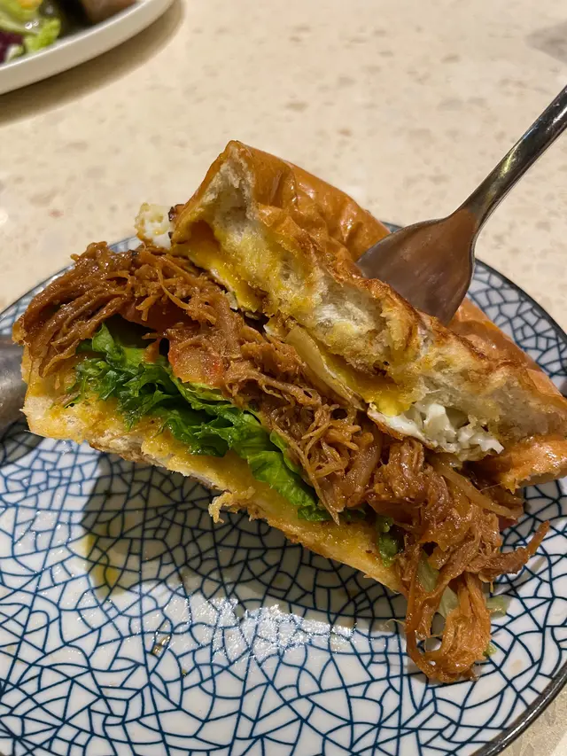 今次要求唔要紫洋蔥,廚師換成白洋蔥,真係勁好食呀!麵包微脆有牛油香,太陽蛋煎到蛋汁流出,手撕豬仔肉冇死甜,與白洋蔥混埋,味道自然。同老公一人半個都覺得唔夠喉。