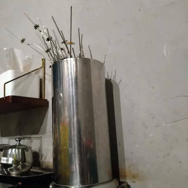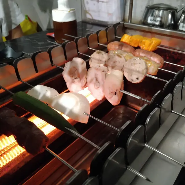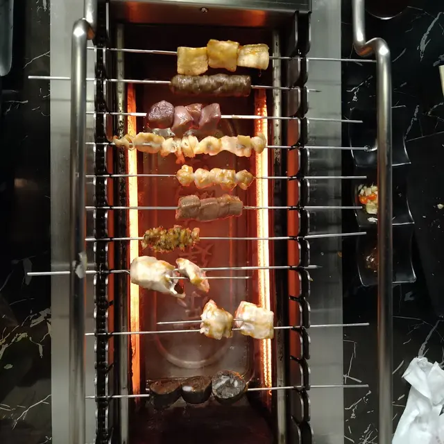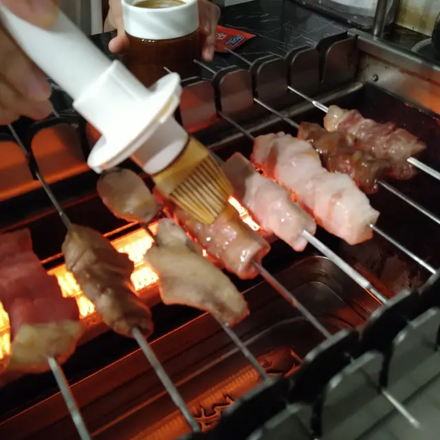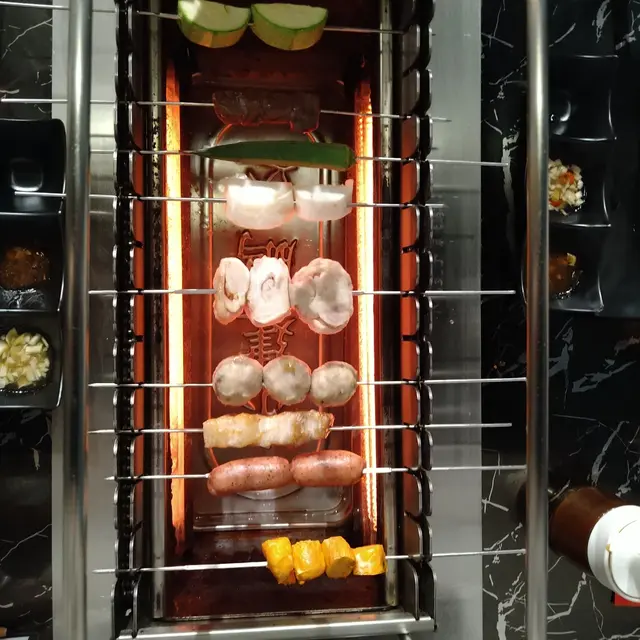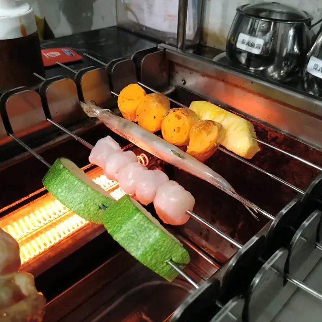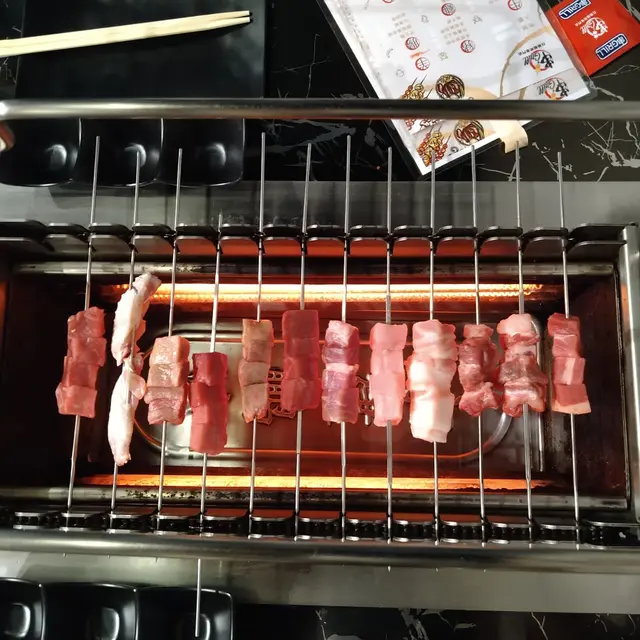 個燒爐有個大滾輪,放啲串好既食物落去,啲串串會自轉,所以啲食物燒得特別均勻。但啲串串就要放得好,齒輪對岩位,咁先轉得順,放唔好就會卡住唔郁呀啦。