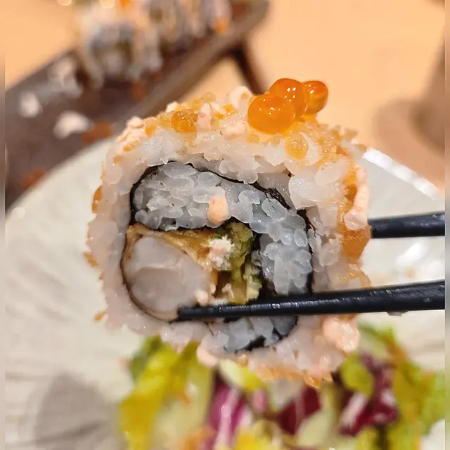 米飲粒粒分明,口感紮實,裡面有生菜及大大隻炸蝦,面頭有魚子及天婦羅脆脆,點啲wasabi食,有有鮮味有香脆,層次豐富!!
