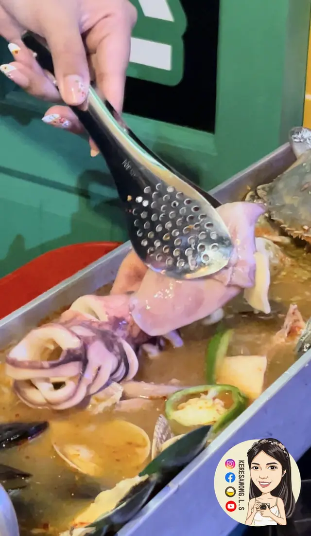 擺盤上檯都好有儀式感, 用兩個gas爐先足夠承托住呢個長50cm長不銹鋼鍋, 承載著滿滿海鮮, 鍋內放了多款海鮮, 包括扇貝、原條魷魚、虎蝦、沙白、青口、蟹同埋鮑魚, 所有貝類都冇沙, 虎蝦幾大隻又爽口, 鮑魚已被去除內臟, 而且爽口有鮮味; 但蟹雖然大隻, 不過肉質不是一梳梳嘅實肉, 鍋內仲有大量大豆芽、鮮菌片、娃娃菜等....盡吸湯汁, 微辣惹味。