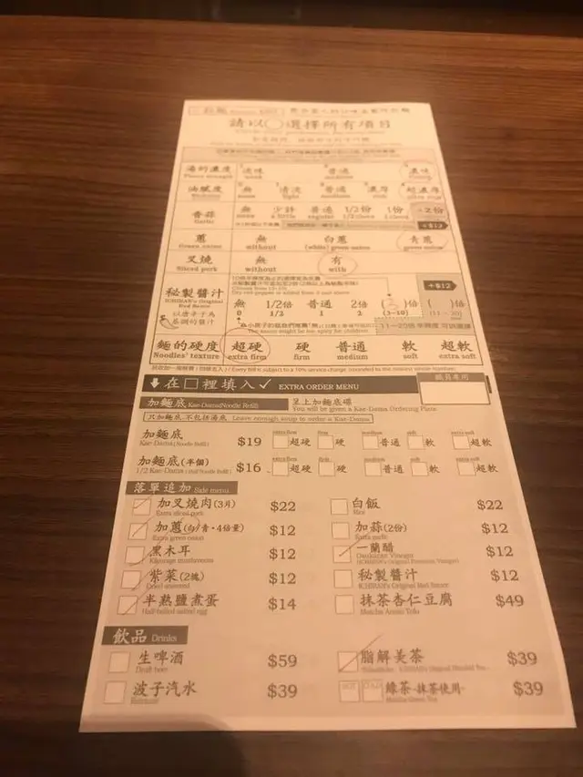 美食定價貴,總會給人有高檔之感,再加上長店外排隊的人龍,總會令人有錯覺,必定是非吃不可的美食。就是那天見在銅鑼灣一蘭拉一麵極長的人龍,心中純純欲動想吃一碗,終於入座了,早已填了選項追加每款要12元,香蒜兩傷又加12元,拉麵㸃了超硬口感,湯和油膩度都要超濃,通常吃拉麵我會先喝湯頭,湯太咸了,濃郁的湯不代死咸,湯不是濃而是咸,油膩度夠勁,只是咸又滿口油,味感太差。拉麵要特硬,其實是要吃到麵的韌性,可是硬不是太硬,嫌軟身,但掛湯力不足,唯一好是沒有鹼水味,跟日本正宗一蘭的拉麵有落差,而叉燒太薄,不夠香和豐膄,溏心蛋叫合格,但蛋味差些,其他追加實在不值要多加$12元,甚麼解脂美茶收我$39,唉,唔算好吃的拉麵,服務普通,重收加一,唔好去搶!