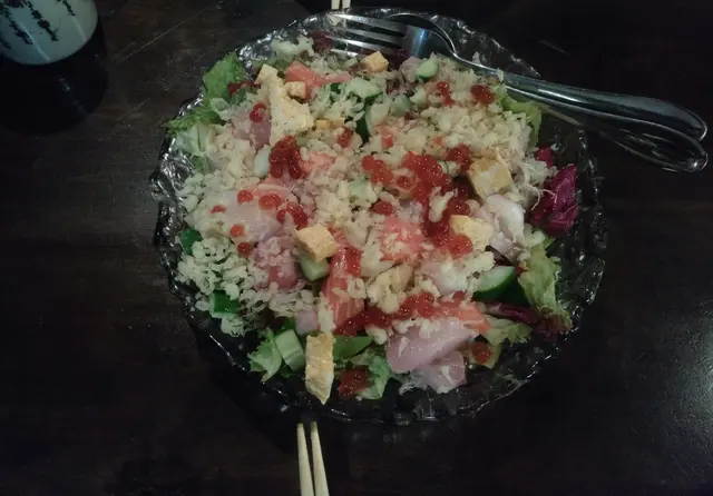 好彩我地兩個唔係太肚餓,叫得唔係好多,因為呢份海鮮沙律係超級大份,入面充滿左角切魚生、沙律菜、玉子等,最令我估唔到既,係竟然加左天婦羅脆粒落去,本身咬落全部都係菜既沙律,突然多左一份脆感,呢個係口感上加左唔少分!另一份都屬於冷盤既係刺身拼盤,拖羅油脂感好重,一啖放入口你會感覺到魚油係充滿哂你成個口腔。三文魚腩切得好厚,啖啖魚肉好滿足。海膽非常鮮甜,唔腥,佢係吞左落口之後,會再隱隱淡出小小甜味,好新鮮!