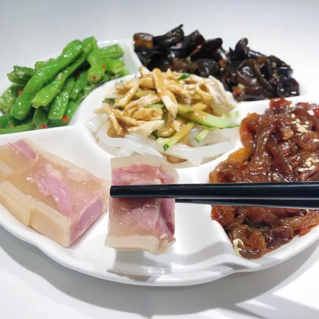 先來一個五小碟,裡面五款配菜可自由選擇。蒜香四季豆爽甜,味道不太刺激;涼拌小木耳反而比較辣;海蜇顏色偏深色,味道卻不太濃,爽口彈牙;另外還有鎮江水晶肉和雞絲粉皮,賣相精緻,份量也不少,抵吃前菜之選。