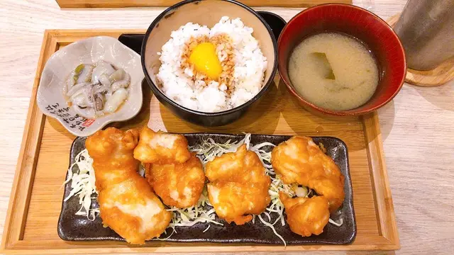 我選擇南蠻炸雞+¬醬油蛋飯+配山葵八爪魚粒. 炸雞外形有啲似巨大化嘅美式快餐店”名物”, 食落味道竟然都相似. 個炸皮好薄好脆, 肉質滑腍無雪藏味, 唔會好實同難咬, 就算凍咗都又香又脆, 係好食版嘅”名物”. 醬油蛋撈飯就一定係好食, 毫無懸念食哂成碗飯.