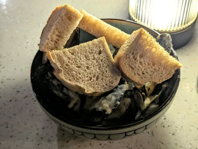 頭盤白酒忌廉煮青口,先以多士沾上白酒忌廉,而青口大隻肉質鮮甜,約有十餘隻。