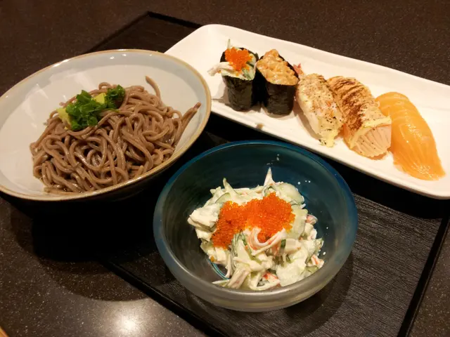 壽司質素普通,不過紫菜稍腍。小食 - 蟹子沙律,材料是青瓜片、蟹柳絲和蟹子撈成,材料新鮮爽脆,味道不錯。熱食 - 冷蕎麥麵,麵條煙韌彈牙,入口冰涼。