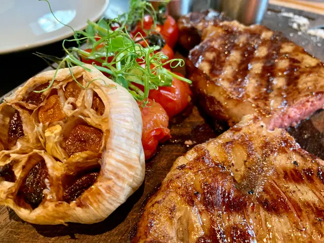 美國安格斯肉眼扒12安士,要7成,一切開加分,生熟度剛好7成,保持肉汁牛味頗濃,肉質有口感!有香草醬同另一汁。。不過食扒較喜愛簡單。。配點海鹽或黑椒便可以!配菜焗蕃茄鮮甜juicy, 焗原個蒜頭。。這個很讚啊!(因不多餐廳有焗蒜做伴碟啊)焗製後的蒜頭,沒有了那份辛辣,換了香甜軟稔,配一口牛扒伴食,豐富了味蕾!