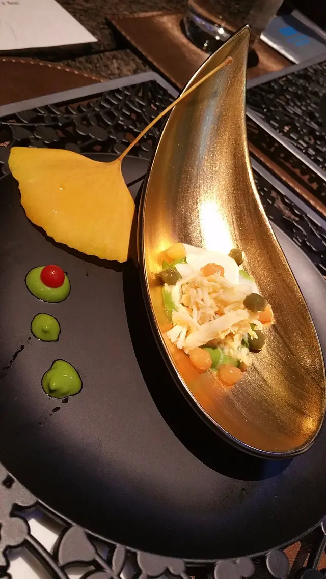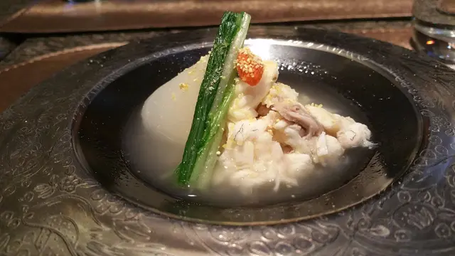 一片漂亮的銀杏葉帶來秋天的氣息,配上精美的擺碟,瞬間擄獲我的好感和相機。上田師傅用他拿手的抹茶製成醬,伴上松葉蟹肉和豆乳製成的湯葉蒟蒻,以及細細粒的柑橘粒,口感獨特。抹茶醬令蟹肉添上creamy的口感和淡淡的優香,蒟蒻晶瑩通透和滑溜的質感,令醬汁凝結於其表面,咬落具有彈性。11月至3月屬於松葉蟹當造期,此時食用絕對屬於時令食物,難怪拆下來的蟹肉倍覺鮮甜。而抹茶醬則是神來之筆,融薈了整道菜色,令美味升級。