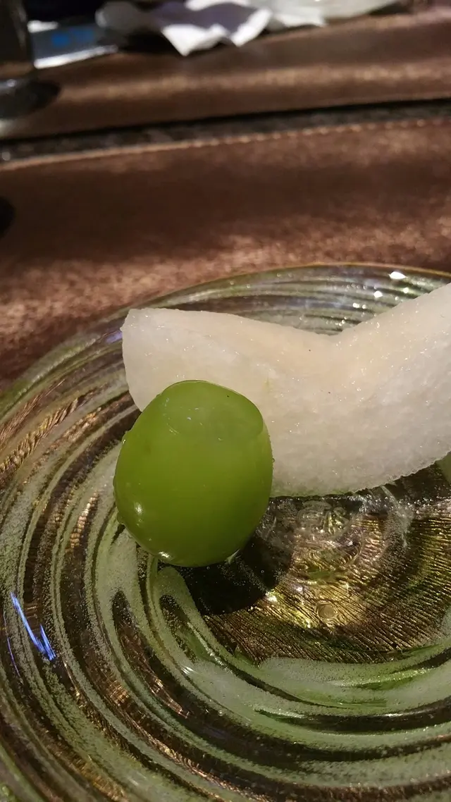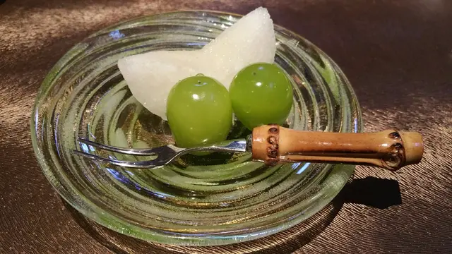 終於還是來到了尾聲,簡簡單單的一片日本梨和青提,青提輕輕切了一刀平頂,讓青提不會滾來滾去,不得不感嘆師傅的細心,青提甜美飽滿,梨則清甜生津,為這餐劃上完美句號。
