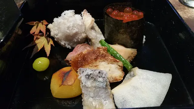 揭開蓋子的驚喜,內有金線魚、三文魚籽軍艦、粟子和炸芋頭等,排列豐富,用上橙色、白色、綠色等配色擺碟,加上左上角配了兩片小紅葉,賣相特別精緻,又富秋天氣息。首先,不得不讚的是三文魚籽軍艦,用料實在新鮮,每顆三文魚籽都像是新鮮取出的程度,內裡配上醬油,恰到好處,鮮甜至極!而炸芋頭亦綿糯非常,皆因秋天正是芋頭當造的時節,此時的芋頭粉糯得來零舍香甜,加上日式料理的炸物技巧,特別鬆脆好食!