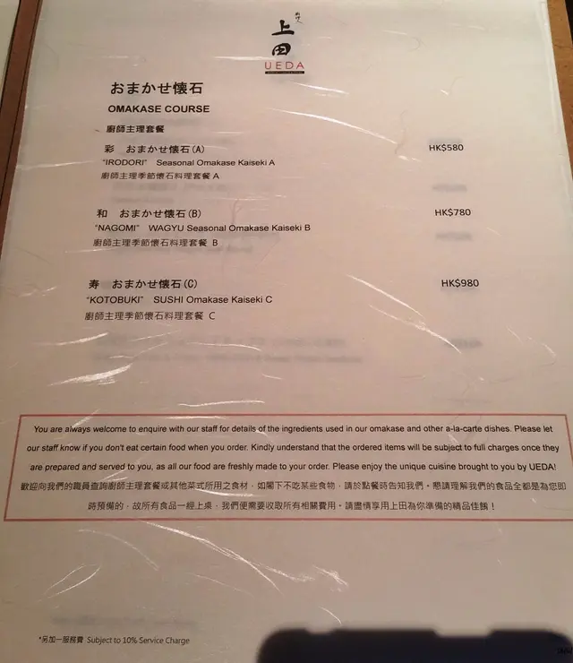 話說Omakase懷石分了三種:彩(A-Irodori)$580、和(B-Nagomi)$780、寿(C-Kotobuki)$980