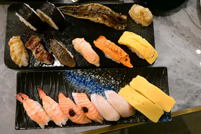 壽司- 點了黑松露三文魚壽司、甜蛋壽司、油甘魚壽司和熟蝦壽司。無論壽司或刺身,三文魚都係必點嘅食物,加埋黑松露,更顯矜貴😚