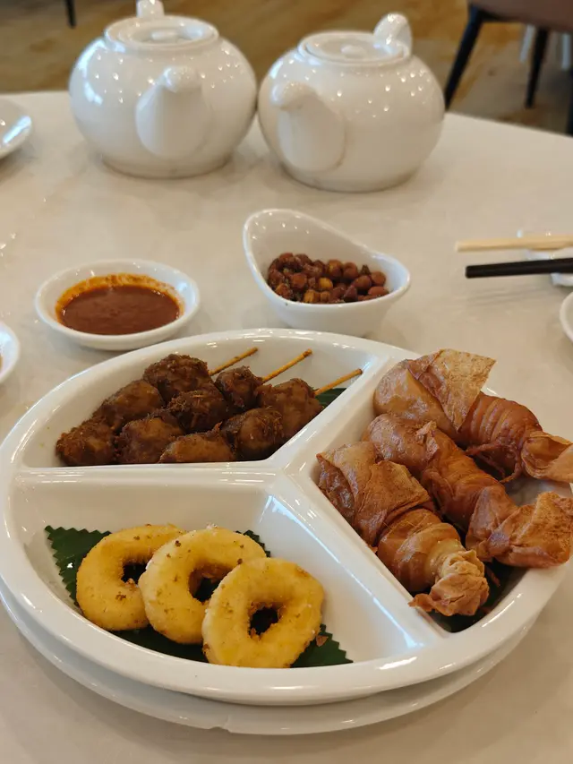 ✨亞洲小食三拼盤 - 素蝦卷爽口酥香、沙嗲串燒濃郁惹味、酥炸蒟蒻外脆內彈,各具風味🤗