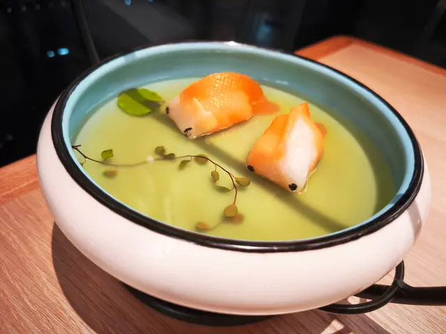 點心造型好似金魚, 晶瑩剔透, 放喺湯入面真係似「金魚游水」