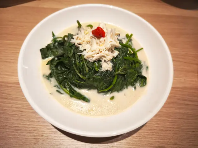 蟹肉鮮甜, 番薯葉苗吸咗湯底, 食落清新又有少少豆香同鮮味交織, 健康感十足