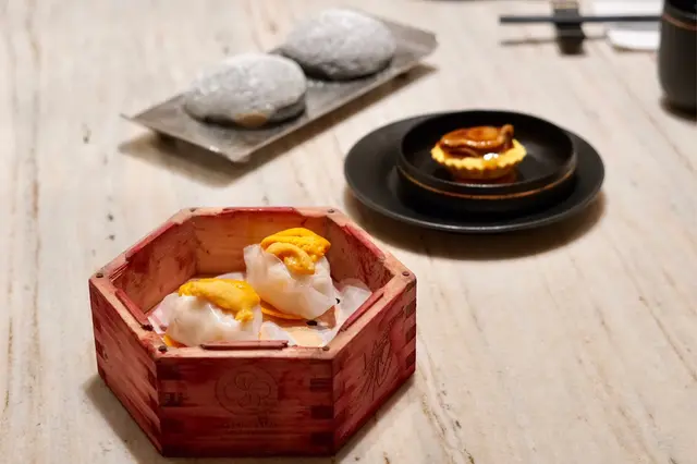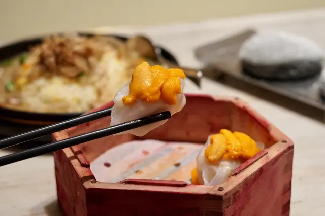 用紅菜頭汁染色嘅粉紅蒸籠非常搶眼,唔係用化學顏色去整所以絕對唔洗驚食壞肚,海膽鋪滿係餃子上面,滑嫩順口,餃子皮薄唔痴牙,蒸煮時間同過程掌握得好好