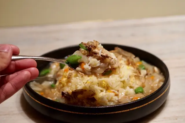花膠爽滑,切成碎粒再堆砌係飯嘅外圍,唔洗自己再由一大舊慢慢咬開,非常方便,芡汁唔會好濃稠,相反為炒飯帶黎濕潤嘅感覺,顯得高貴好食