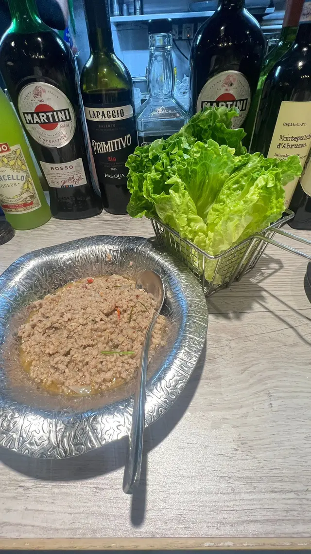 當熱氣騰騰的鐵鍋端上桌,那混合著濃烈香茅、檸檬葉與金不換的辛香氣息,已如熱帶風暴般席捲感官。廚師毫不吝嗇地將滿滿一勺閃著油亮光澤的豬肉碎傾入新鮮翠綠的生菜葉中。急不可待地包裹送入口中—— 新鮮生菜的爽脆冰涼與熱辣肉餡在舌尖轟然碰撞!