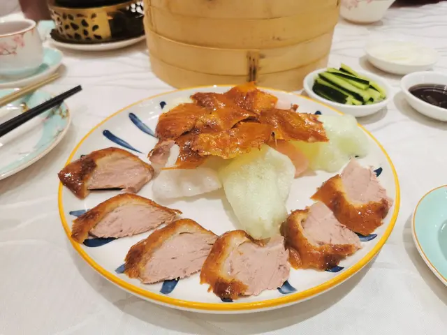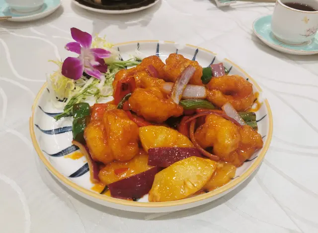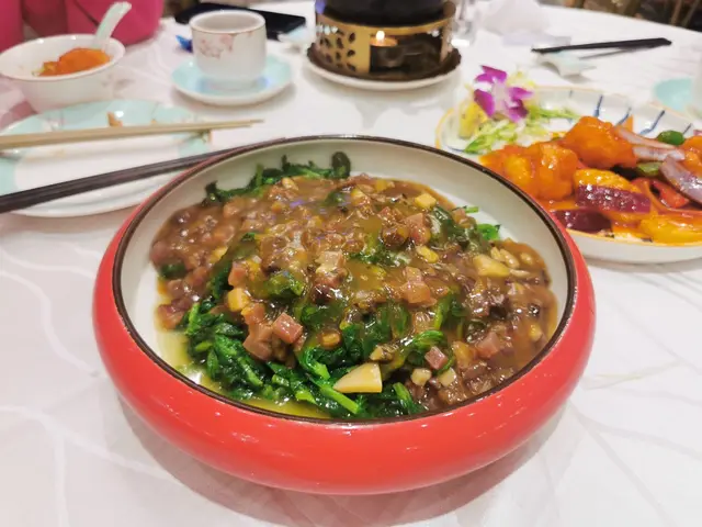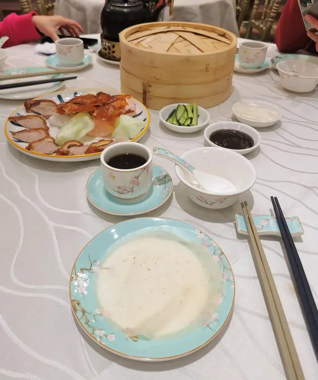 酒樓新裝修, 粉藍色碗碟好靚😍😍 , 茶壺仲有燭台保溫 , 尢其依家冬天, 飲茶唔會涷 , 呢個加分👍👍我地叫咗片皮鴨例牌,賣相唔錯 , 仲有蝦片 , 咕嚕蝦球 ,甜酸度剛好, 蝦球好大粒, 好多菠蘿 , 梅子炆豬手好淋 , 臘味炒苗,幾大碟 , 樣樣都好味道😋😋, 食得好飽,又坐得舒服! 朋友拎咗個蛋糕仔手信食完飯一齊食, 果時已經差唔多10點,