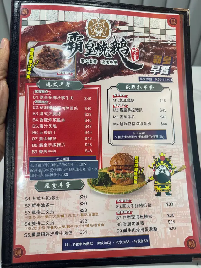 新開的燒鵝冰室 WingninhLevel 32025-07-26510 views Follow 今日行過美孚,見到新開嘅 霸王燒鵝冰室,忍唔住好奇心就走入去試咗個下午茶餐。我叫咗燒鵝燒腩仔雙拼瀨粉,加$8配埋燒腩仔,再要咗杯凍檸茶。燒腩仔屬一般水平,皮係脆嘅,但略嫌唔夠五花腩咁肥美,可能比較瘦啲,口感冇咁豐富。不過燒鵝真係令人驚喜:皮脆得似薯片咁「卜卜脆」,肉質嫩滑又冇油膩感,正!店舖環境都好企理,有香港冰室特色,啱晒打卡~店員有禮,氣氛舒服。佢哋仲有早餐供應,燒味亦可以外賣,下次真係想試吓佢嘅早餐,或者買啲燒味返屋企慢慢嘆!718911103112The above review is the personal opinion of a user which does not represent OpenRice's point of view.LikeShare新開的燒鵝冰室 霸皇燒鵝冰室 https://s.openrice.com/QrKT02w9T00Report Post Ratings5Taste5Decor5Service5Hygiene5ValueDining MethodDine In