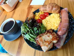 超足料版本的全日早餐。沙律菜無雪過,份量都比較大,配埋意大利醋,好味!雞扒不過不失,香腸好味,煙肉比較鹹。車厘茄同粟米都有焗過,牛角包都係,表面非常鬆脆,熱辣辣,有驚喜!
