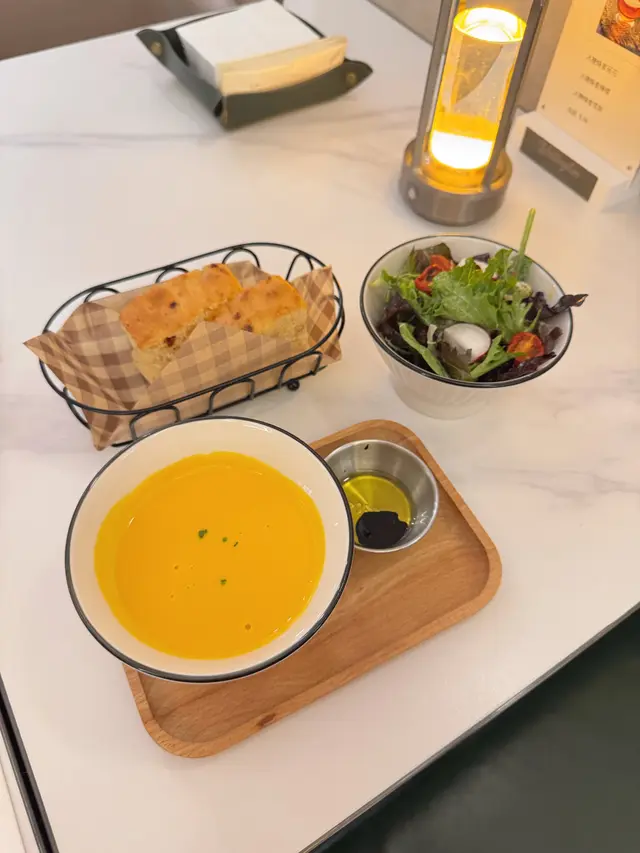 首先清新沙律酸酸地好開胃,隨後有麵包伴隨著的南瓜湯,濃厚而香甜好暖心,麵包有烤過非常好味😋 隨後上場的香煎鵝肝,外脆內嫩,不過覺得可以烤耐多少少。旁邊酸酸哋嘅沙律可以減少返鵝肝嘅油膩感。