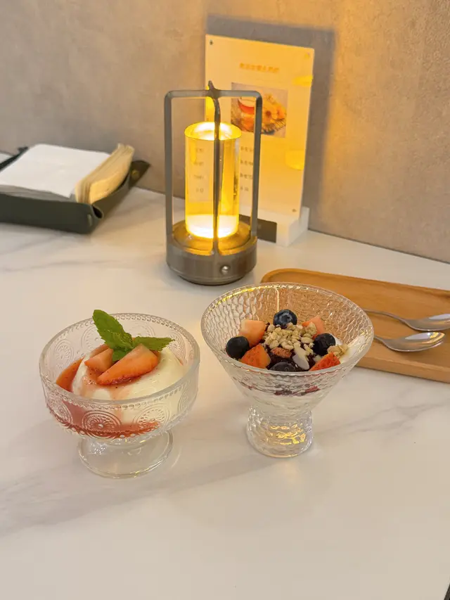 甜品外表好精緻可愛☺️ 鮮果芭菲有清新嘅草莓🍓藍莓,牛奶布丁滑順醇厚!一個美好嘅結尾