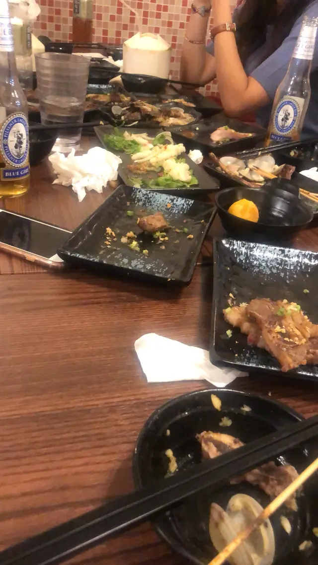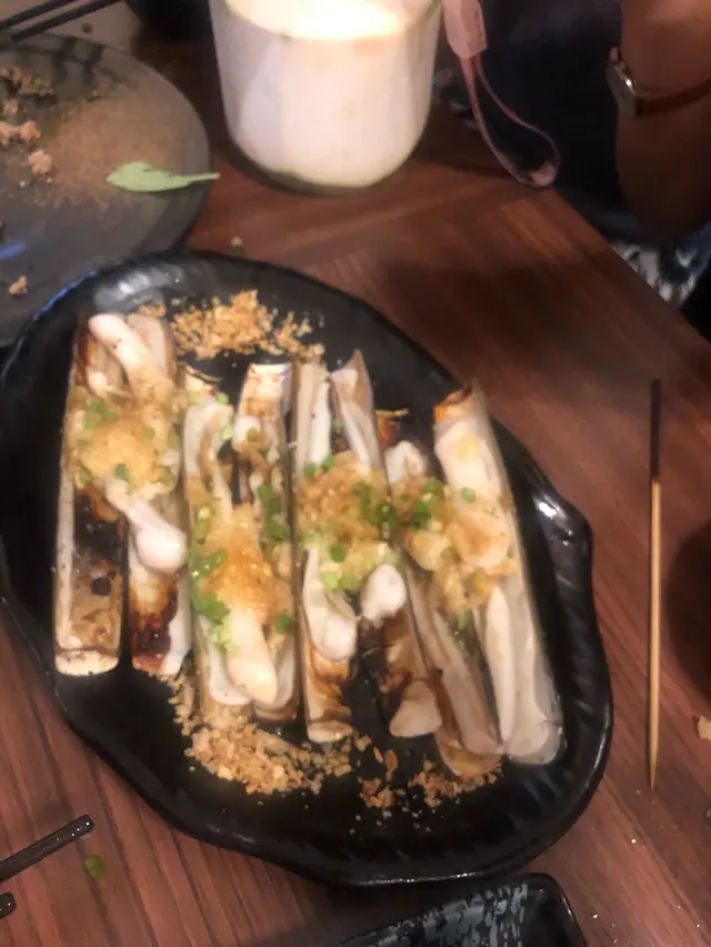 一坐低就即刻叫咗個古法烤魚,蒜蓉蒸蟶子,蒜蓉燒生蠔,酥炸鴨舌,燒帶子,燒牛脷,燒原隻魷魚,咖喱軟殼蟹配薄餅等等,食到好飽滿足