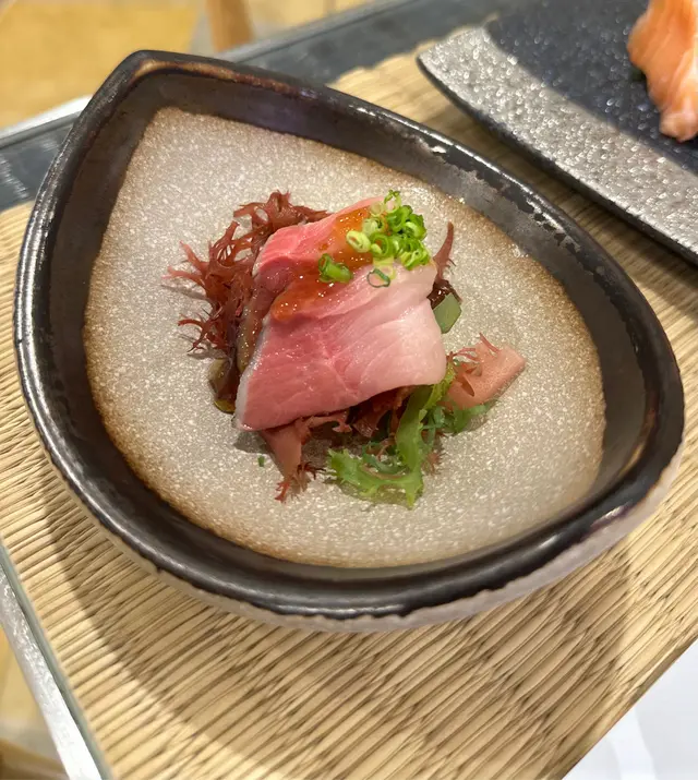 晚市套餐包括刺身、壽司和熱食。油甘魚細軟甘香,伴以爽口海帶沙律,酸汁水晶提昇了清新度。