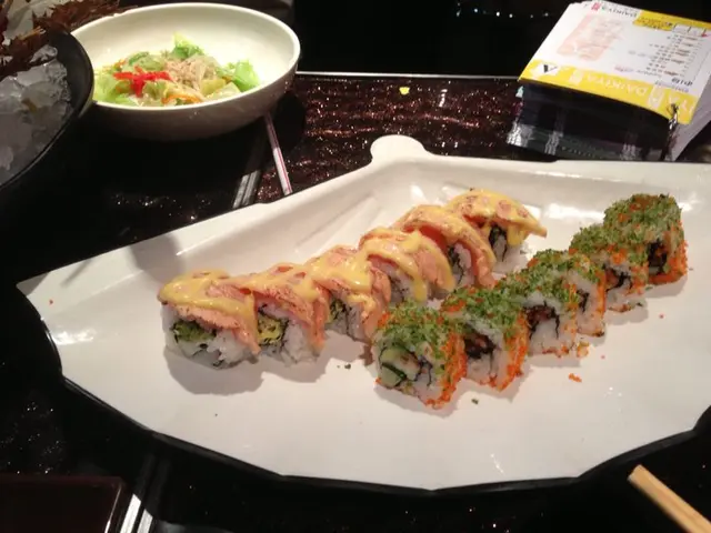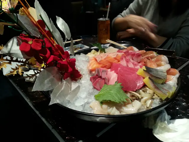刺身在冷冷的碎冰上, 色澤光鮮的