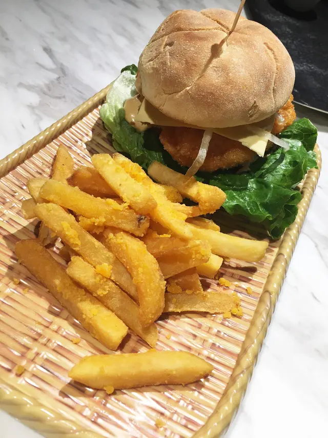 蝦堡大大個,一個人食哂就實飽飽,蝦餅一樣好食彈牙可口,呢個包配搭埋生菜同夾埋裡面有少少辣既醬,相當惹味。仲有咸蛋黃薯條,一樣香脆好味,呢set好邪惡呀~