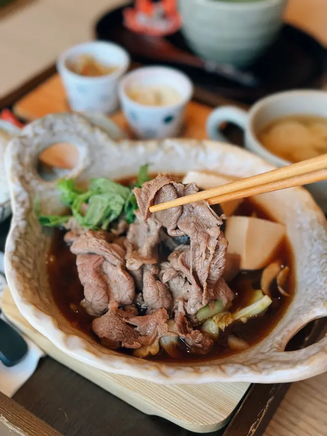 呢款定食性價比最高!牛肉量多,而且口感滑溜。壽喜燒有齊溫泉蛋、豆腐、野菜、野菌等等,湯底入味。另配日本珍珠米同漬物,整體味道都不錯🧡對比上次黎亦都keep到水準